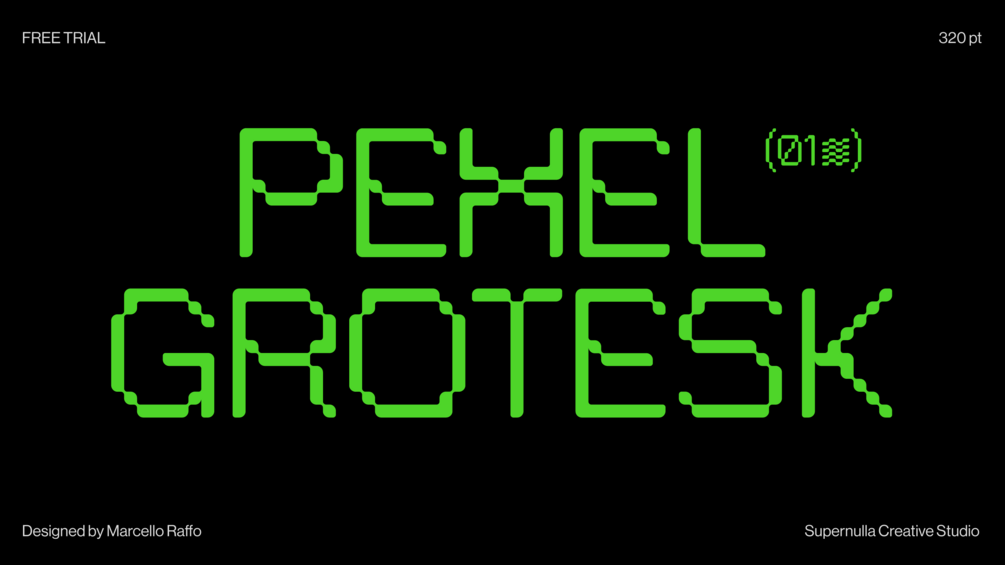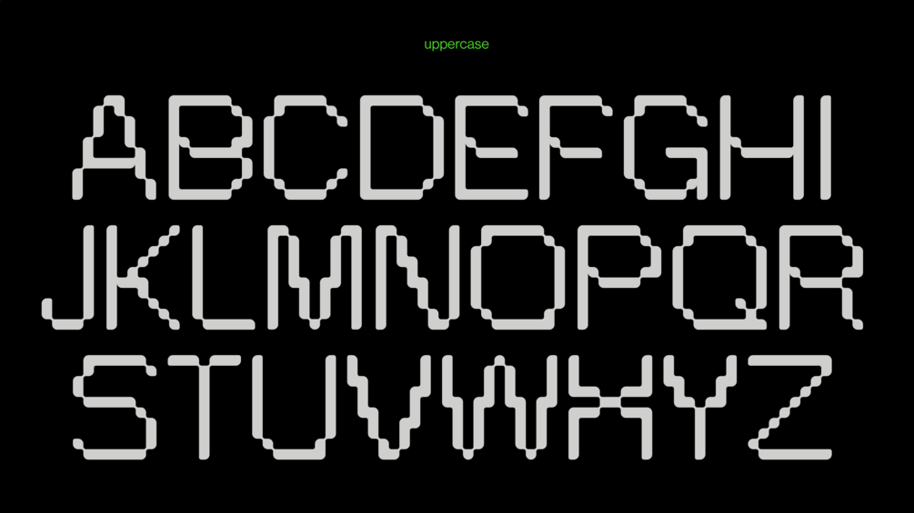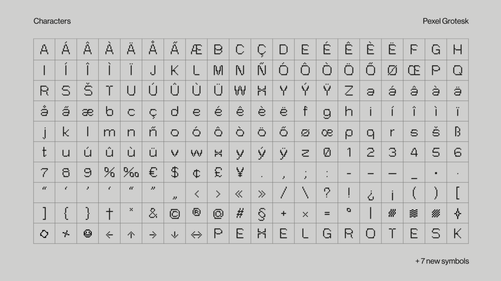 Pexel Grotesk© imitates the letter dimension and proportion of a grotesque font while remaining inside his strict grid. The roundness of the edges, that could sound like an oxymoron for a pixel type, gives at the type an interesting shape, especially if it is used in large format.